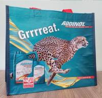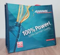 Из переработанных ПЭТ-бутылок, с печатью ADDINOL (обе стороны) и вшытыми ремнями для переноски длиной 60 см